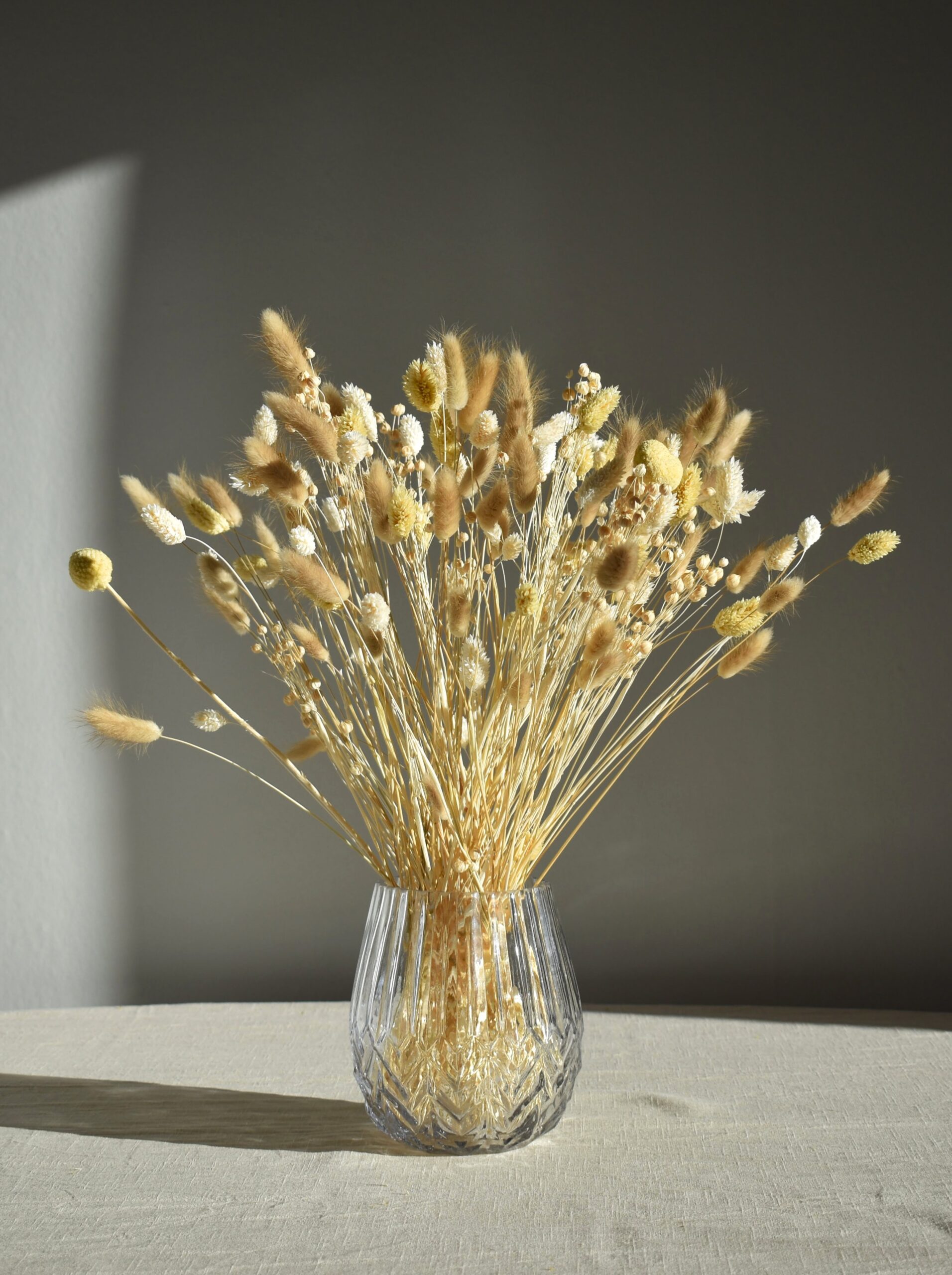 Bukiet został wykonany z lekkich i dekoracyjnych dmuszków, mozgi kanaryjskiej, lnu oraz kraspedii – charakterystycznych złocistych kuleczek, które dodają oryginalnego akcentu i struktury. Rozłożony w wazonie pięknie wypełnia przestrzeń, stanowiąc dekorację sypialni, salonu lub korytarza. Starannie dobrane elementy tworzą spójną, trwałą dekorację, która nie wymaga pielęgnacji i zachowuje swój urok przez długi czas.